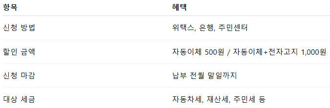 - 예를 들어, 카드·자동차세·재산세·주민세 4건 모두 신청하면 매건 1,000원, 연간 최대 4,000원 절세 효과 누릴 수 있어요.